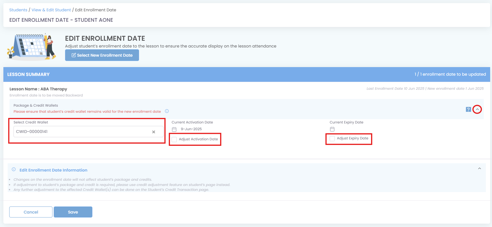 - Adjusting Activation/Expiry Dates: You can update the activation or expiry date of the credit wallet, if necessary, by checking the corresponding boxes. This action will enable new fields to set the dates.