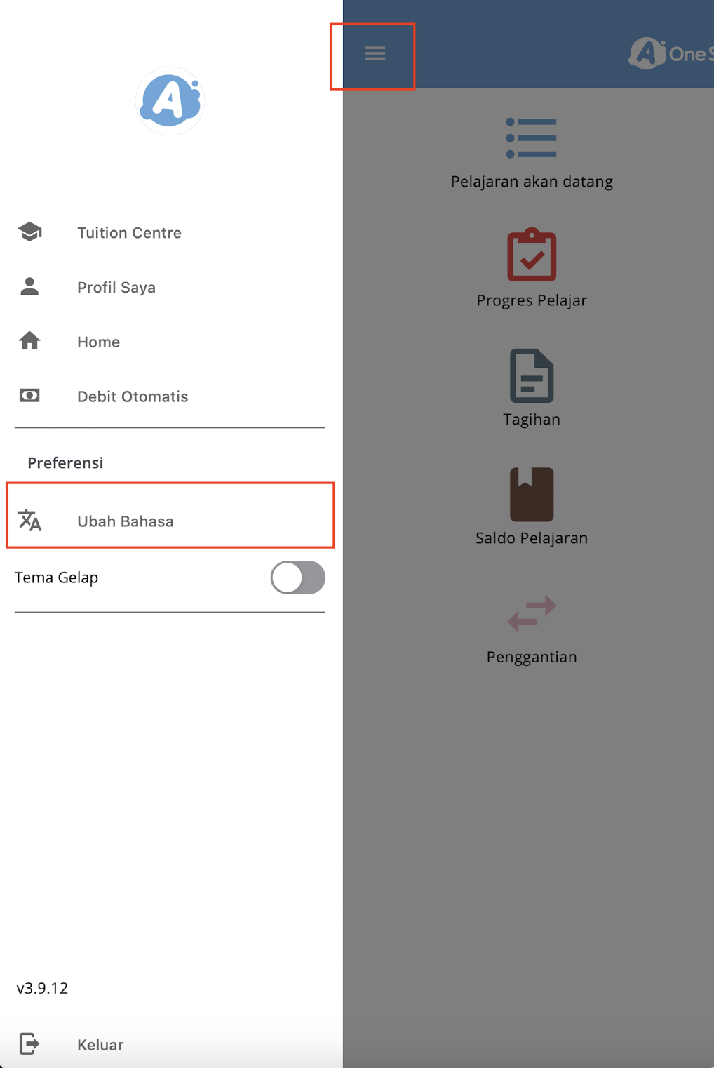 - Anda dapat mengubah bahasa melalui halaman login utama dengan mengklik pilihan bahasa di kanan atas, atau dengan mengakses menu di kiri atas dan memilih "Ubah Bahasa.