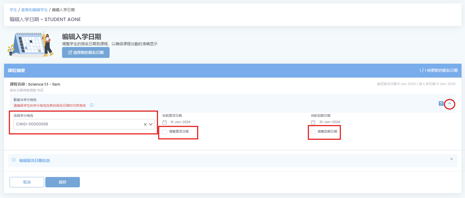 - 将入学日期向前调整:如果新日期早于原始日期,摘要中将仅显示更新后的入学日期和配套与学分部分。